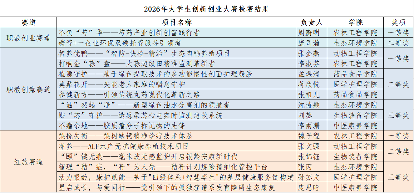 为深入贯彻落实党的二十大和二十届历次全会精神,积极响应国家关于深化高校创新创业教育改革号召,进一步激发青年学子创新创业热情,培育新质生产力,搭建大学生创新创业实践平台,我校年初启动了2026年大学生创新创业大赛校赛,3月15日大赛圆满落幕。